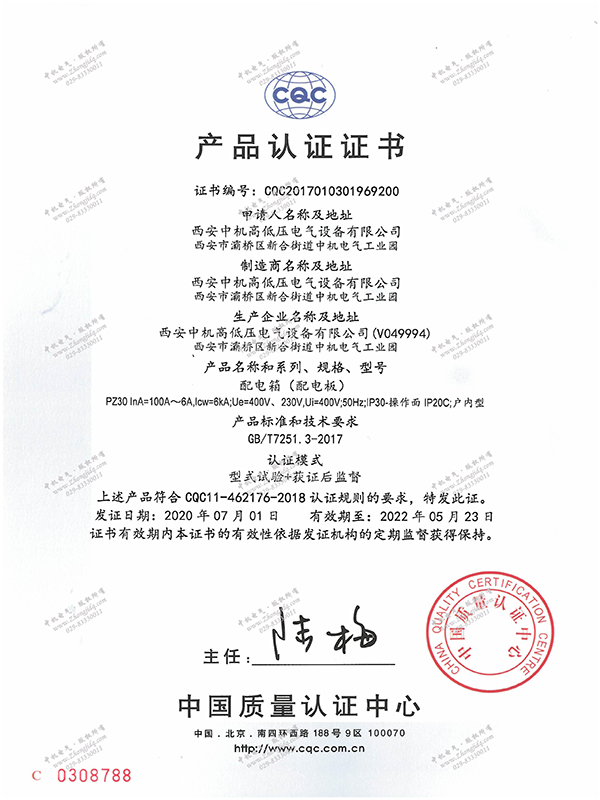 PZ30配電箱產(chǎn)品認(rèn)證證書