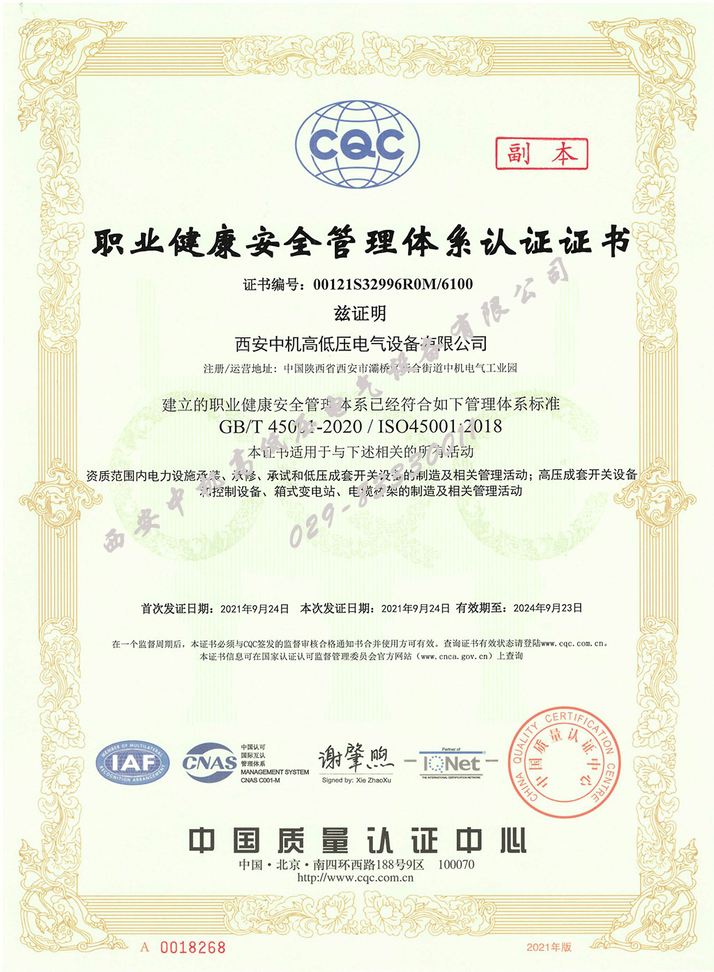 職業(yè)健康管理體系證書45001
